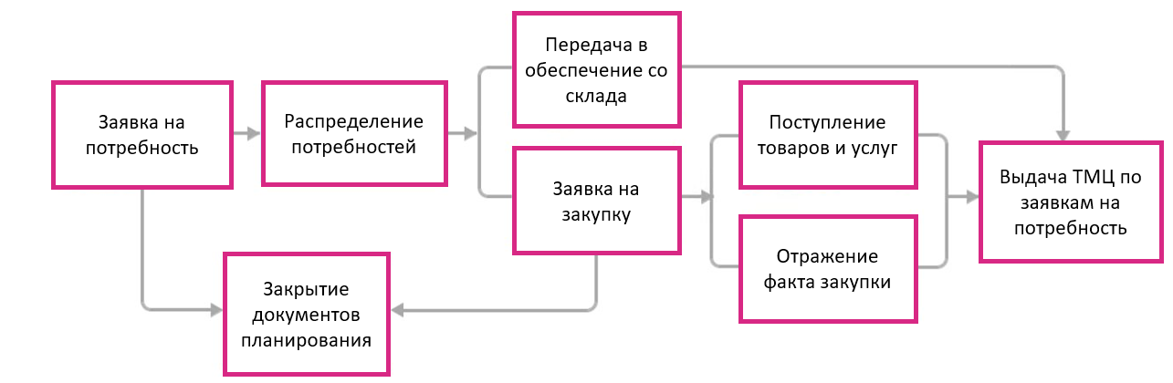 • Отражение факта закупки и выдачи ТМЦ по заявкам на потребность;