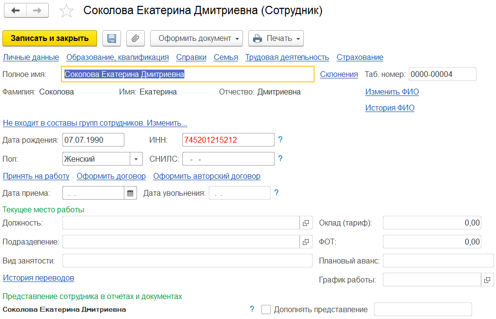 Далее нам необходимо перейти в раздел «Кадры», справочник «Сотрудники» и создать нового. Заполняем фамилию, имя и отчество, ИНН, СНИЛС, дату рождения, пол. Программа автоматически проверит по фамилии, имени и отчеству, есть ли такое физическое лицо в справочнике, предложит его использовать или создаст новое. В этот момент очень важно не пропустить, если такое физическое лицо уже есть в базе, чтобы избежать дублирования данных. Сохраняем введенные данные.