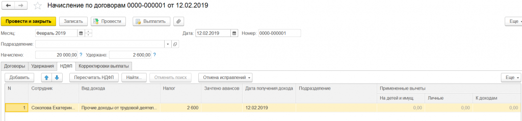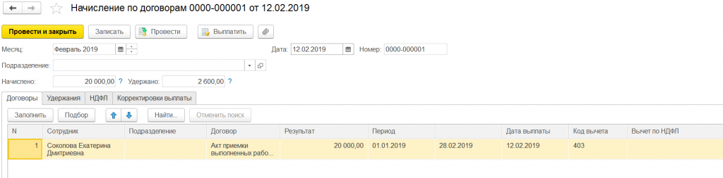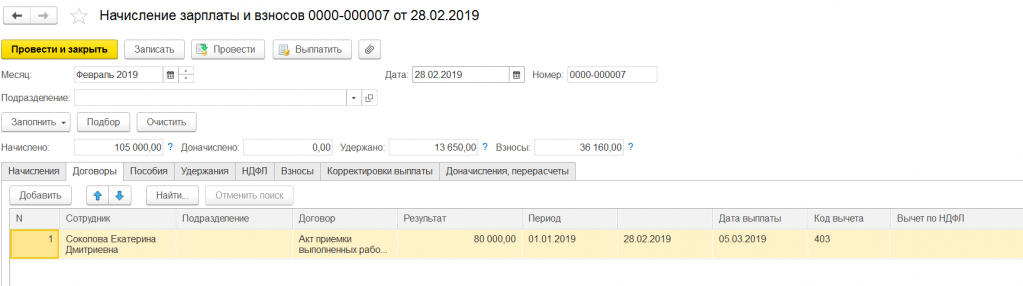 Для итогового расчета заработной платы создадим документ «Начисление зарплаты». Помимо информации о рассчитанной зарплате, налоге на доходы физлиц и страховых взносов сотрудникам предприятия, в этом документе на закладке «Договоры» заполнятся начисления по договорам подряда, рассчитается налог на доходы физлиц исполнителей договора.