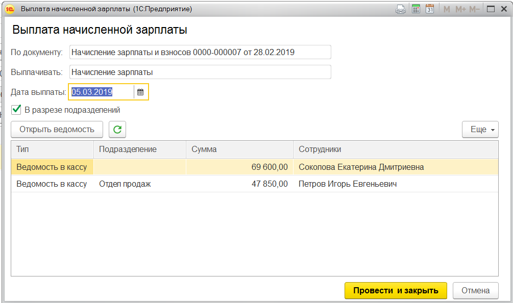После этого в этом документе нажимаем на кнопку «Выплатить», «Провести и закрыть». Программа создаст ведомость в кассу.